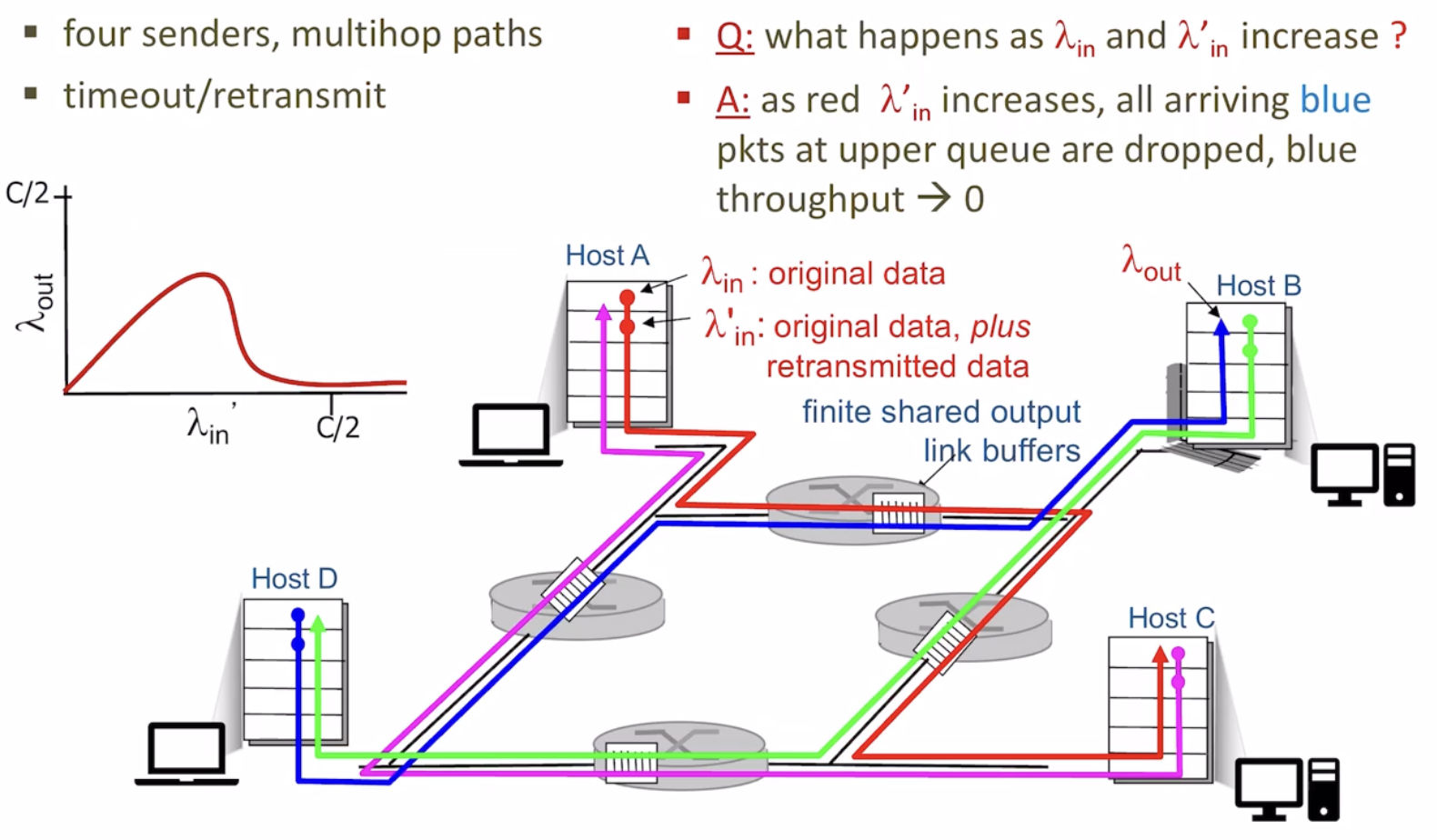 만약 red traffic이 증가하면 blue traffic이 drop될 것이다. blue traffic이 drop 되면 더 많은 패킷을 재전송하게 되고 결국은 pink packet이 drop될 수도 있다. 즉 서로의 throughput은 관련이 있다.