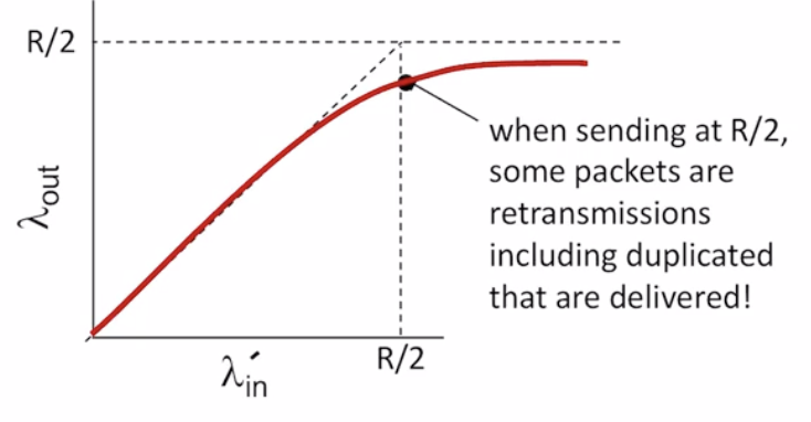 버퍼 안에 중복패킷들이 link 자원을 쓸데없이 소모하기 때문에 때문에 throughput은 R/2에 닿지 못하고 근접만 할 수 있다.