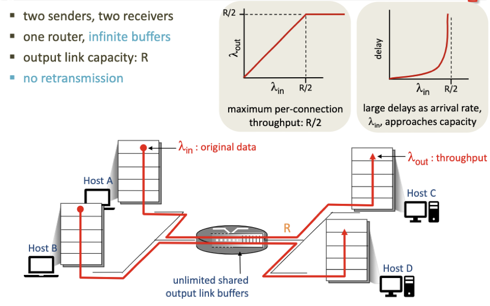 즉 각 호스트는 R/2이상의 속도로 패킷을 보낼 일이 없기 때문에 throughput 그래프를 보면 lamda(in)은 R/2이후로 없다.