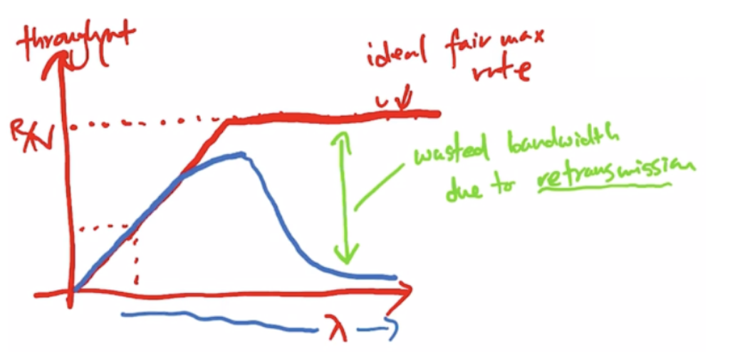 따라서 모두가 계속해서 많이 보내려한다면 각자의 throughput은 증가하다가 갑자기 점점 0에 가까워진다. 이게 congestion collapse이다.