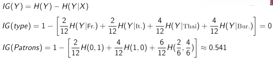 - 각각의 경우 IG를 구해보면 다음과 같다. IG(patrons)가 더 크기 때문에 더 좋은 tree라고 선택한다.