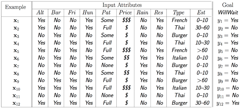 - feature = {alt, bar, fri, ..., est} 내가 배고픈 정도, 식당의 여건 등등
