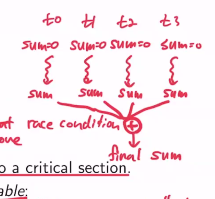 한가지 방법은 sum을 update하는 line을 critical section으로 만들어서 한번에 한 쓰레드만 들어올 수 있도록 한다.