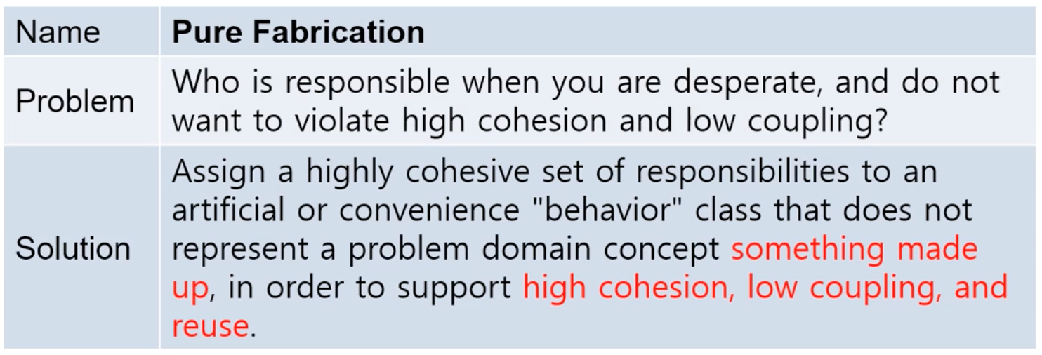 - responsibility를 기존 객체에 추가하려는데 cohesion, coupling issue를 발생시킨다면 아예 새로운 객체를 만들어 버리는 방식이다.