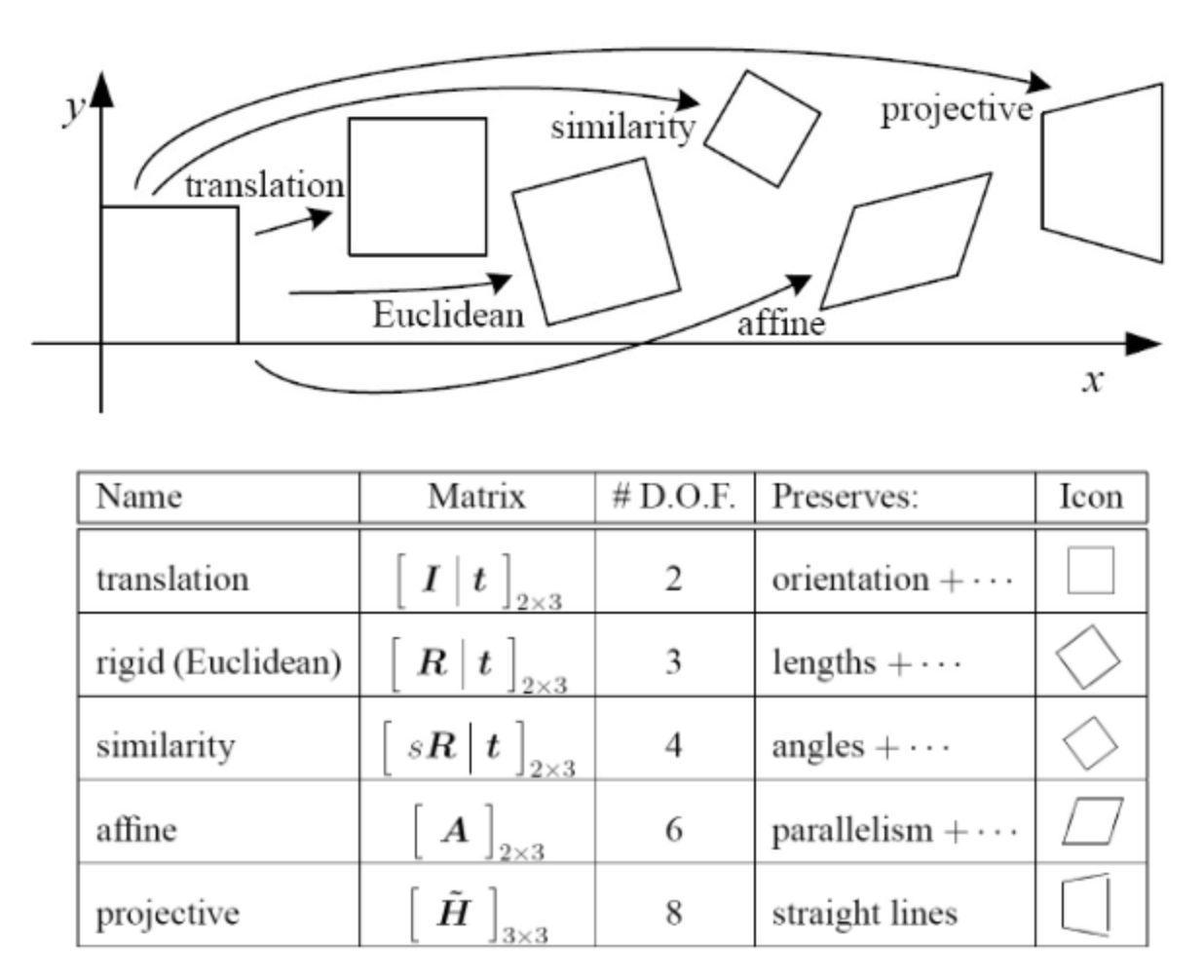 - 변환에 따라서 행렬은 몇 바이 몇인지 DOF(자유도, 찾아야 하는 변수 개수)를 나타낸다.