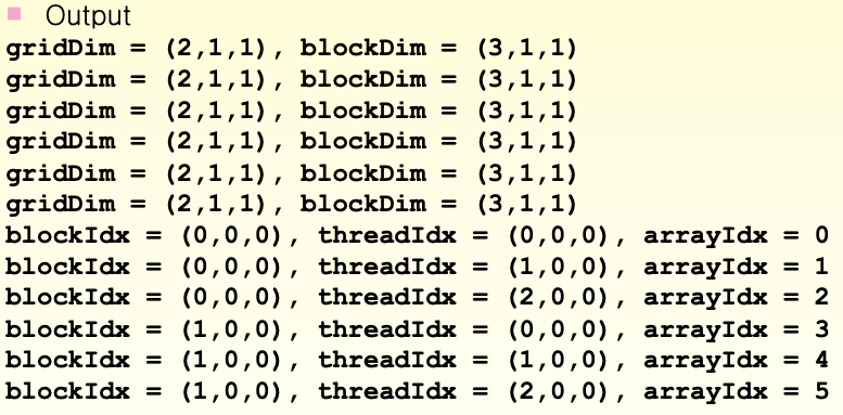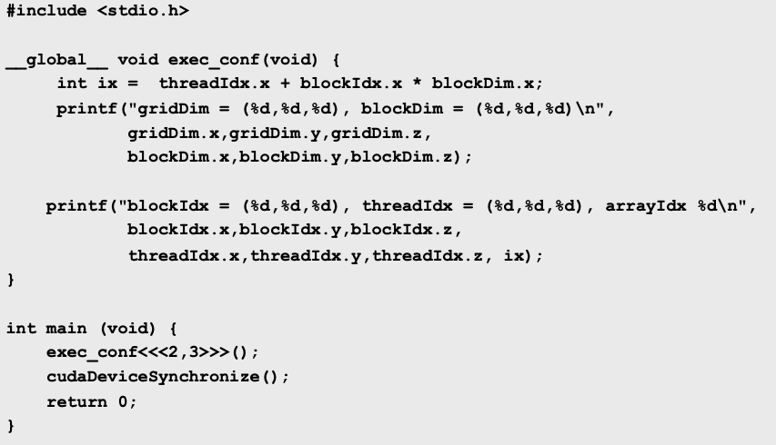 execution configuration을 보면 2개의 block을 생성하고 각 block은 5개의 thread를 갖는다는 뜻이다.