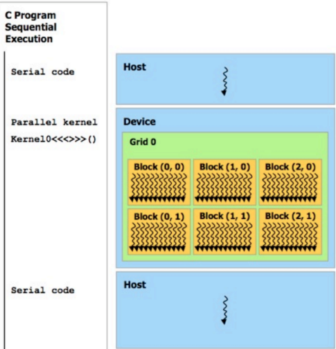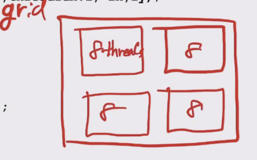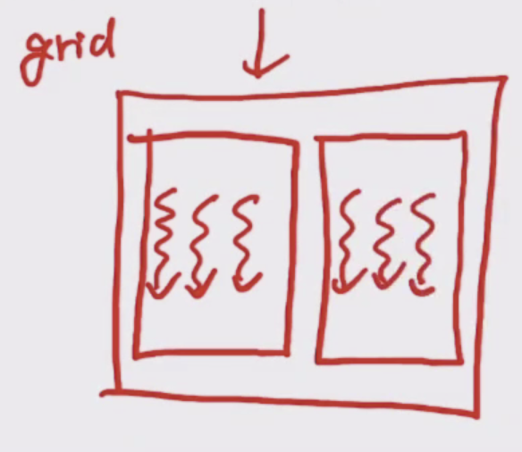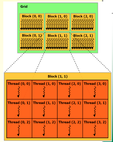 한 kernel function이 한 그리드를 갖고 한 그리드가 block을 갖는다. 각 블럭이 여러개의 thread를 갖는다.
