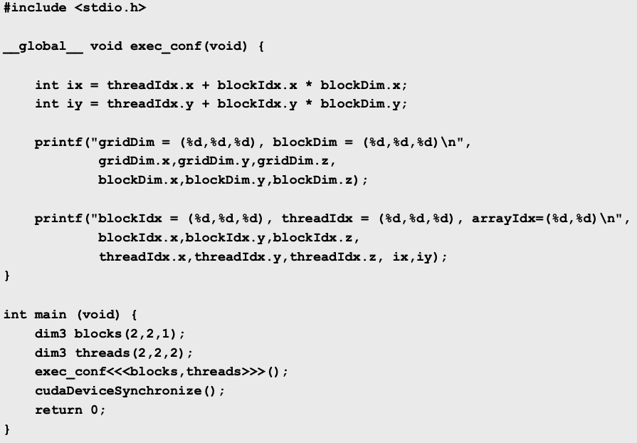 총 4개의 block이 2차원 공간에 있고 각 block에는 3차원으로 8개의 thread가 생성되어 실행된다.