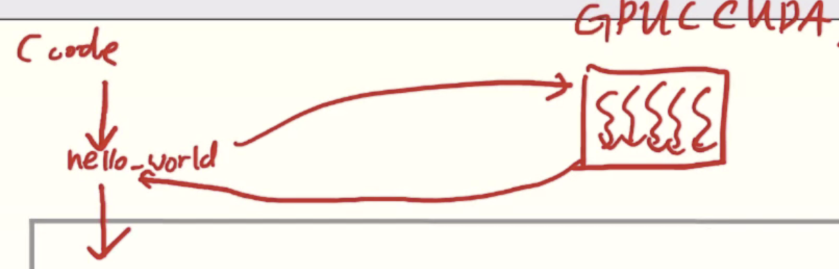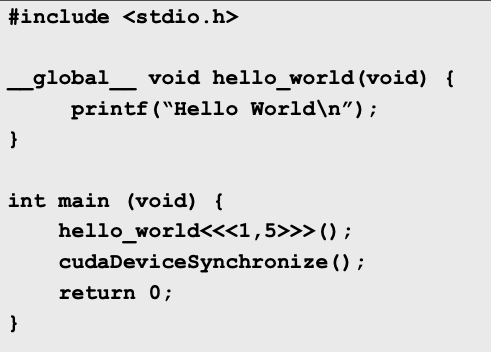 이 문장이 실행되면 hello_world c코드가 gpu로 넘어갔다 실행 종료 후 main으로 다시 돌아온다.