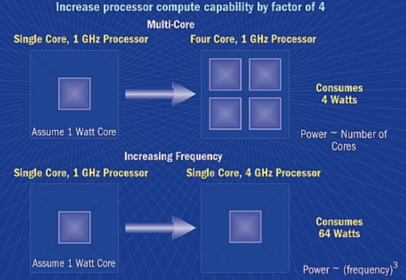 high clock speed에 따라 발열, 소비전력이 커지면서 멀티 코어 활용의 필요성이 대두되었다.