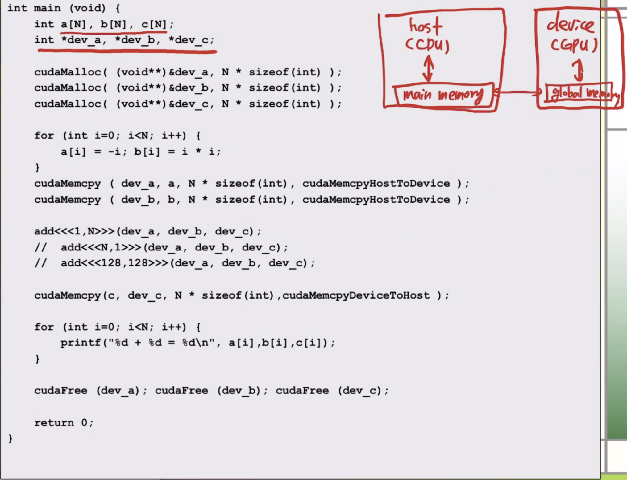 그리고 연산 결과 c를 다시 device memory에서 cpu memory로 복사해온다.