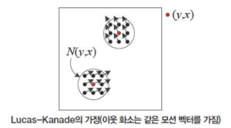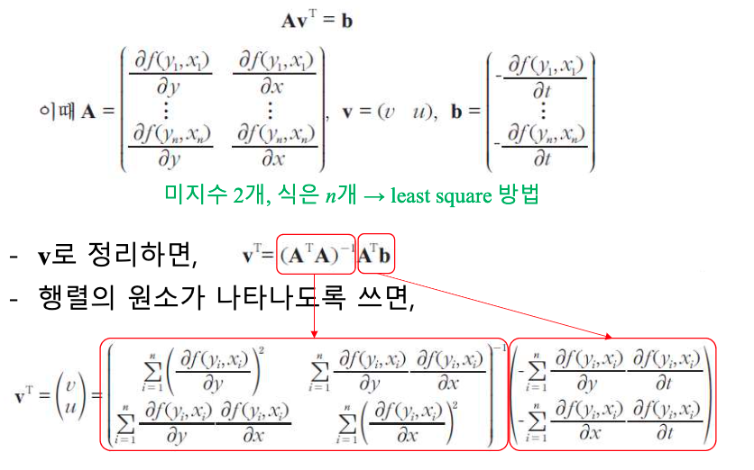 - 이를 해결하기 위해 (y,x)화소를 중심으로 하는 윈도우 영역 N(y,x)내 광류는 동일하다고 가정한다. (Lucas Kanade)