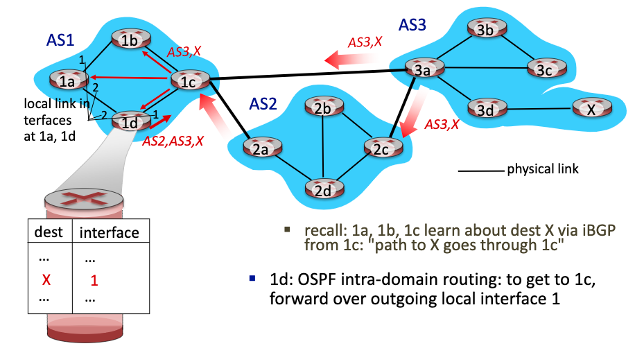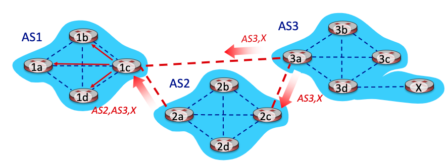 그럼 또 AS2는 AS1의 gateway router(1c)에게 "x로 가려면 AS2, AS3를 거쳐라" 라고 advertise한다. (eBGP)