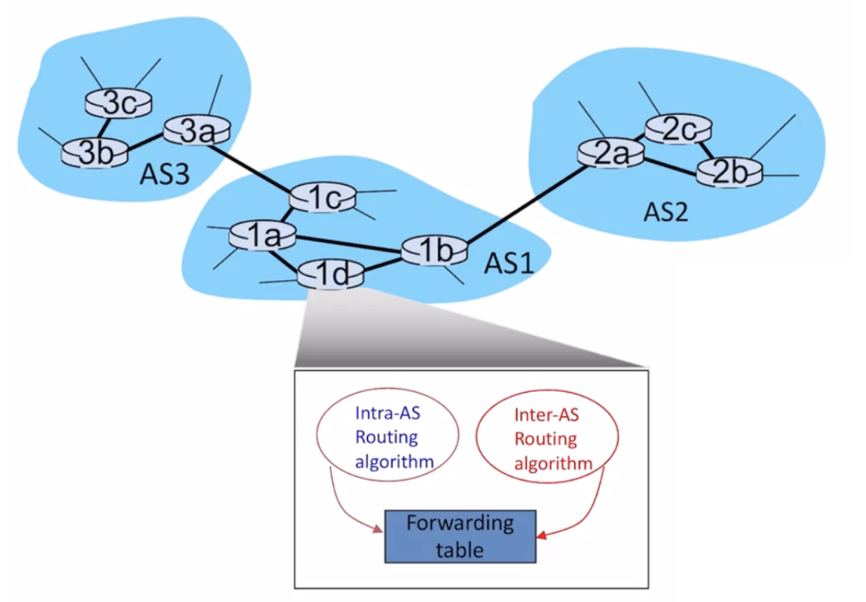 AS안에 node는 inter-AS, intra-AS 알고리즘으로 forwarding table을 만들어서 관리한다.