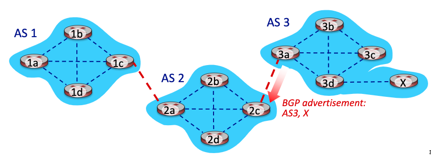 AS3 gateway router(3a)가 AS2에게 "X로 가려면 나를 거쳐라" 라고 advertise한다. (eBGP)