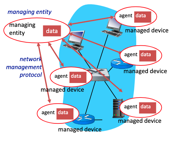 네트워크 관리를 위해서는 managing entity가 필요하다. 그리고 네트워크에 모든 device에는 management agent가 실행되고 있어야 한다.