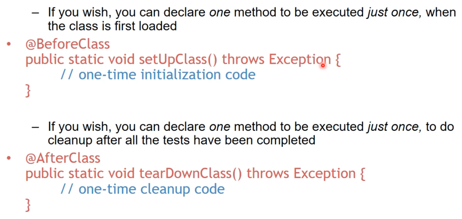 - 아래처럼 모든 test case method들이 실행되기 전/후에 동작하는 메서드도 정의할 수 있다.