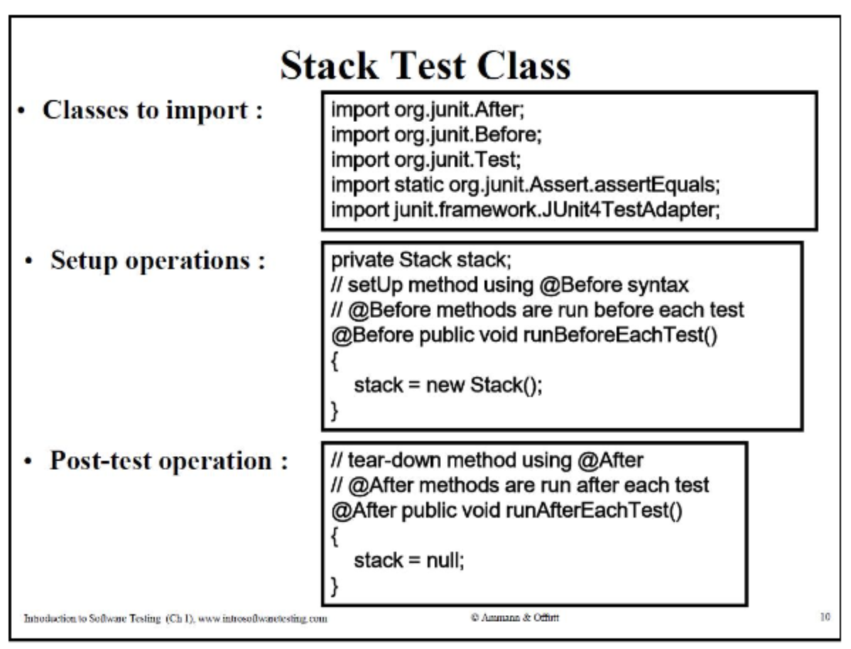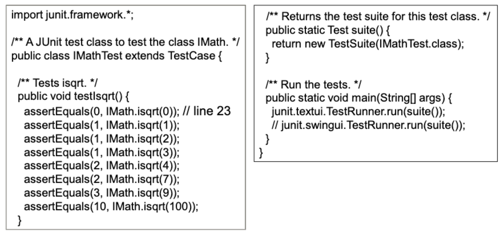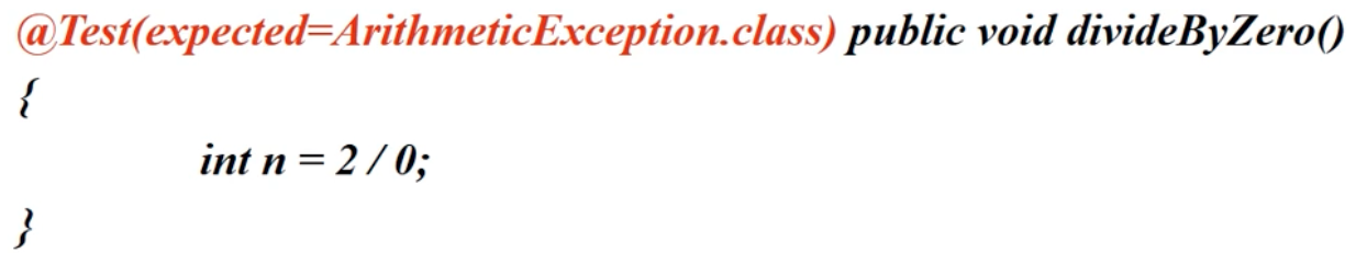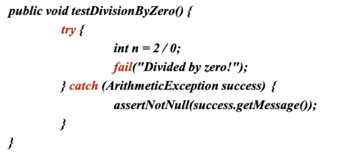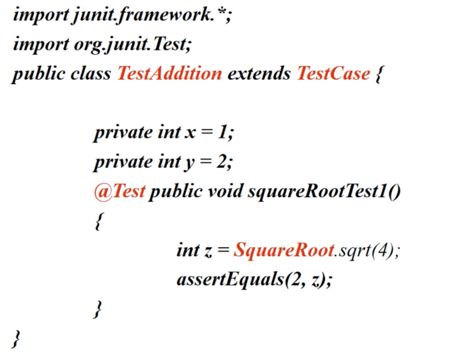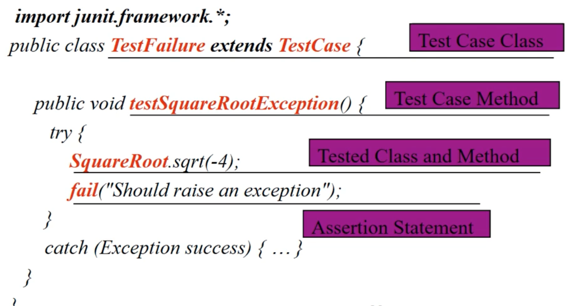 - Junit3의 구버전 이지만 개념은 지금과도 같다. SquareRoot에서 오류가 반드시 발생해서 catch block으로 이동해야 한다. 그러지 못하면 test 실패로 fail을 호출한다.