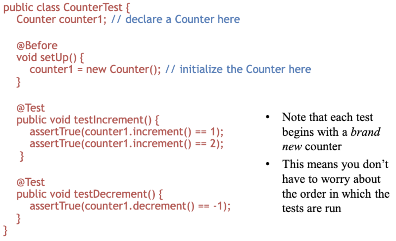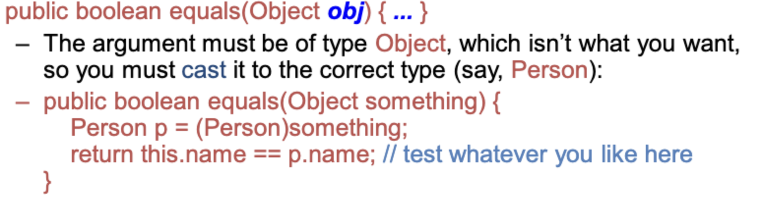 - object를 비교할때 주의할 것이 있다. expected 값과 actual 값의 올바른 비교를 위해 equals를 정의해야한다. (name이 같으면 두 Person object는 같다)