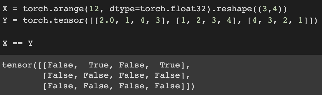 logical statements : compare each value at the same position of tensor(e.g. ==, >, <)