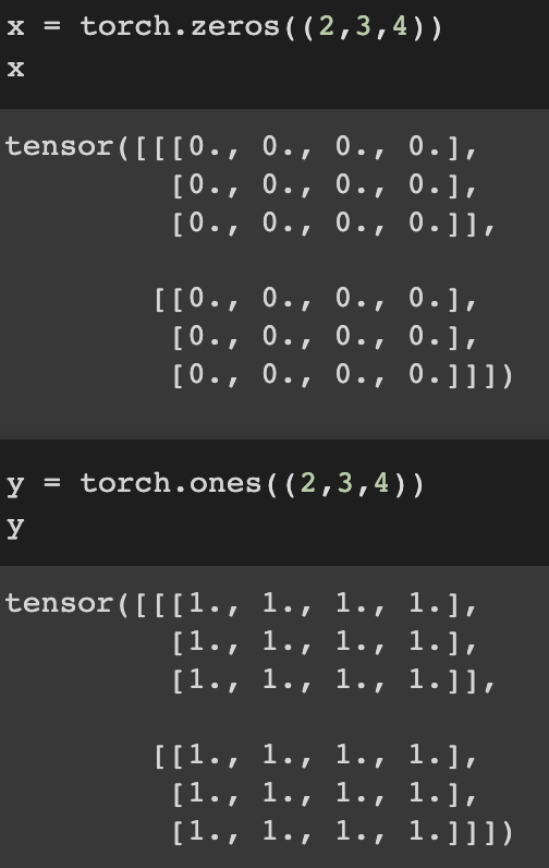 you can also initialize all of the elements into specific values such as zero or one when creating a tensor.