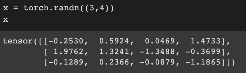 Code above creates a tensor which is randomly sampled from a standard Gaussian normal distribution with a mean of 0 and a standard deviation of 1.