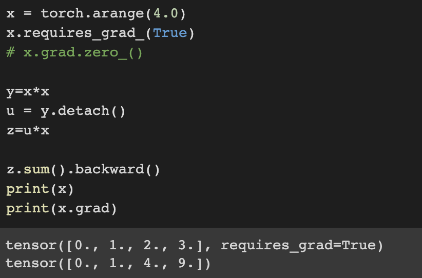 In other words, gradient will not backward u through x, just treat u as a constant (instead of partial derivative z = x*x*x)