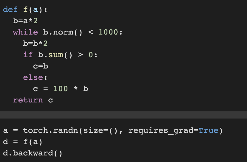 even if building the computational graph of a function required passing through Python control flow (e.g., conditionals, loops, and arbitrary function calls), we can still calculate the gradient of the resulting variable.