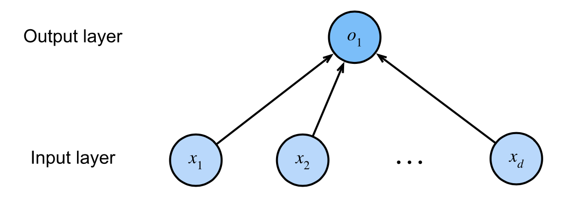 Since for linear regression, every input is connected to every output (in this case there is only one output), we can regard this transformation (the output layer in Fig. 3.1.2) as a fully-connected layer or dense layer.