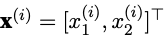 x(i) represents ith example(sample) of the training dataset. Thoese independent variables x1(i), x2(i) are called features(covariates).
