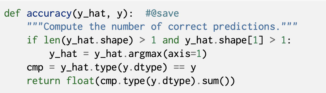 The result is a tensor containing entries of 0 (false) and 1 (true). Taking the sum yields the number of correct predictions.