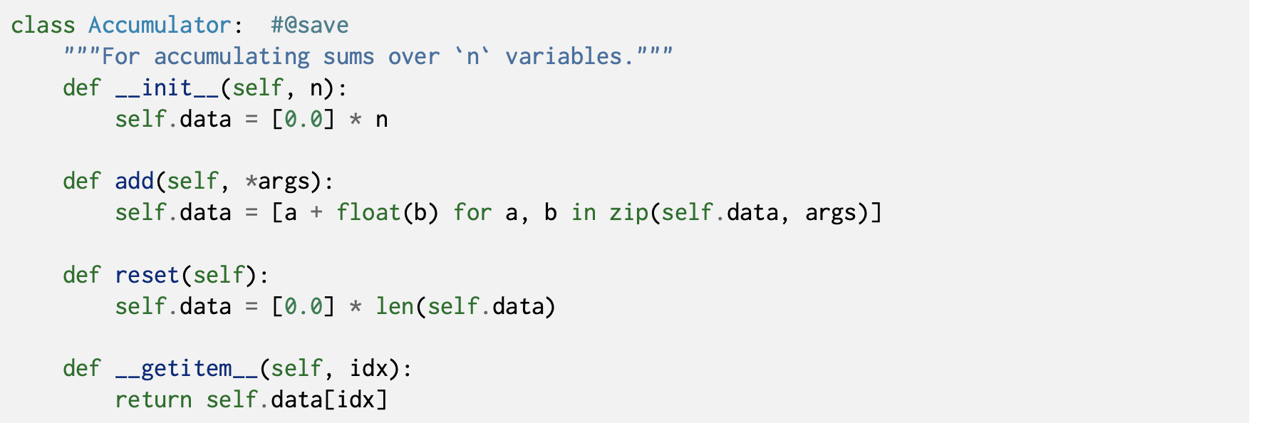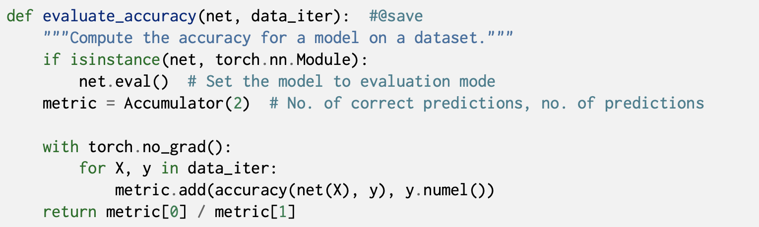 The following training function then trains a model net on a training dataset accessed via train_iter for multiple epochs, which is specified by num_epochs.