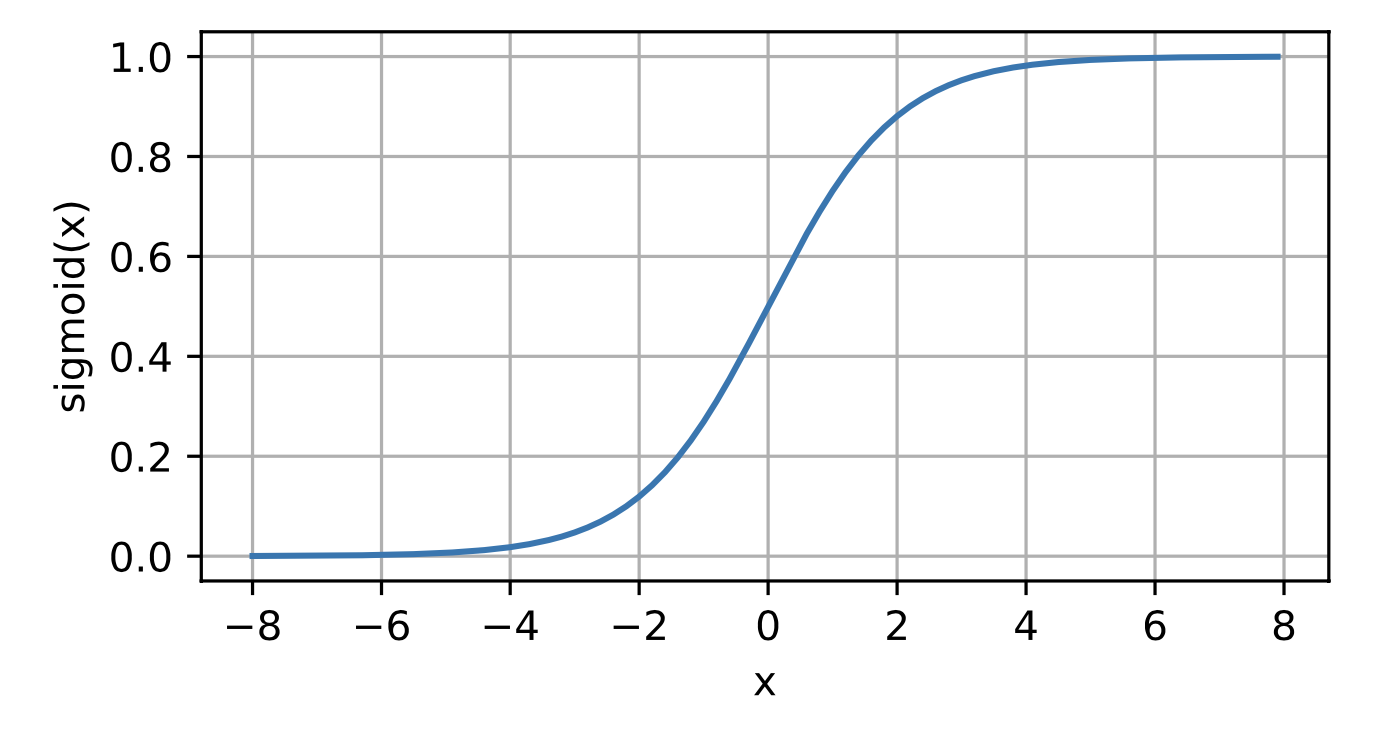 The sigmoid function transforms its inputs, for which values lie in the domain R, to outputs that lie on the interval (0, 1). For that reason, the sigmoid is often called a squashing function: it squashes any input in the range (-inf, inf) to some value in the range (0, 1):