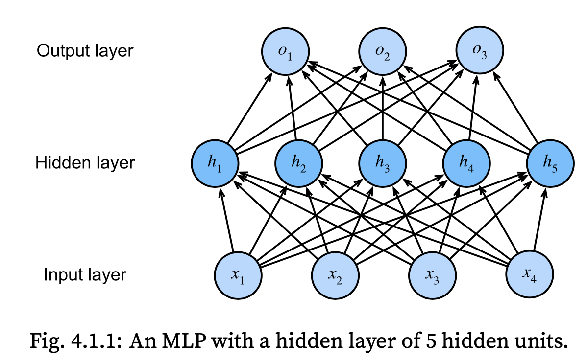 This MLP has 4 inputs, 3 outputs, and its hidden layer contains 5 hidden units. Since the input layer does not involve any calculations, producing outputs with this network requires implementing the computations for both the hidden and output layers; thus, the number of layers in this MLP is 2