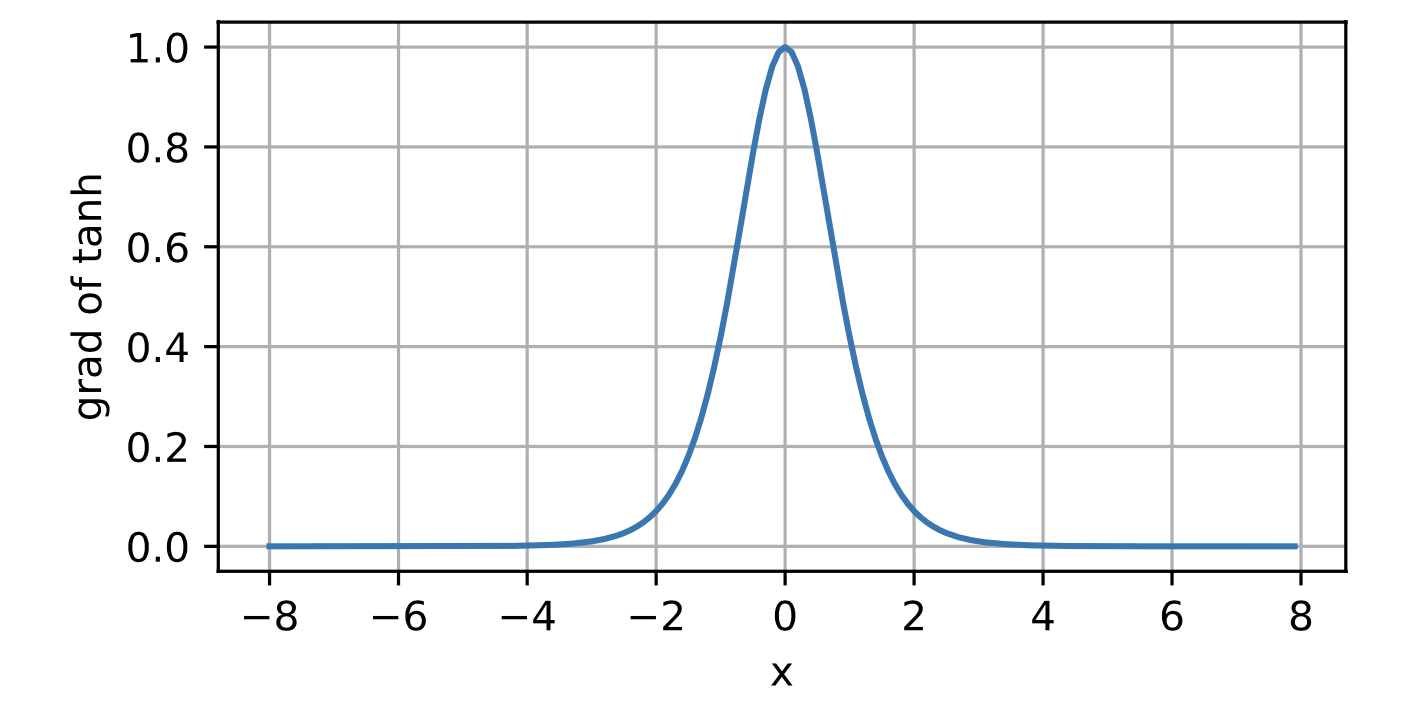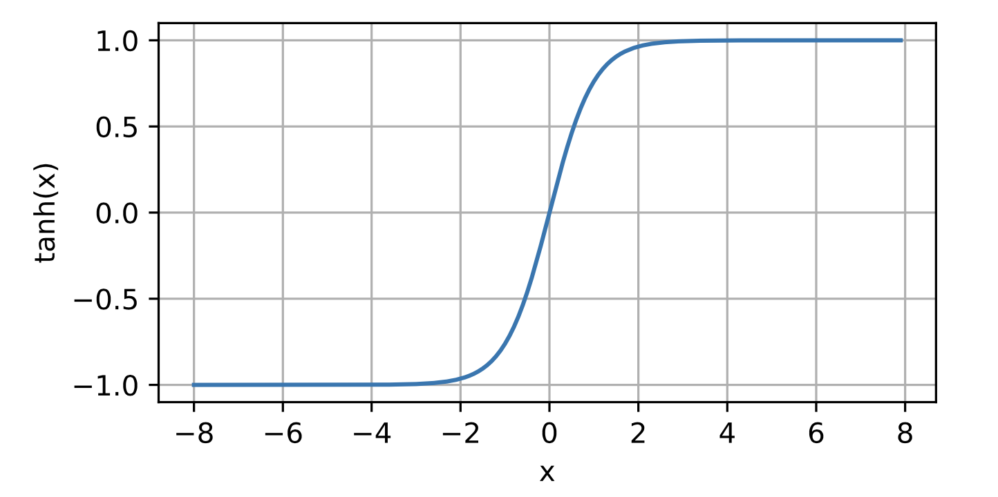 tanh (hyperbolic tangent) function squashes its inputs, transforming them into elements on the interval between -1 and 1