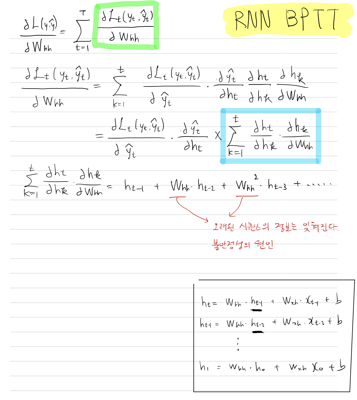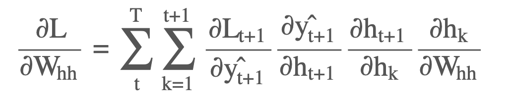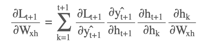 at the time-step t+1, we can compute the gradient and further use backpropagation through time from t+1 to 1 to compute the overall gradient with respect to Whh