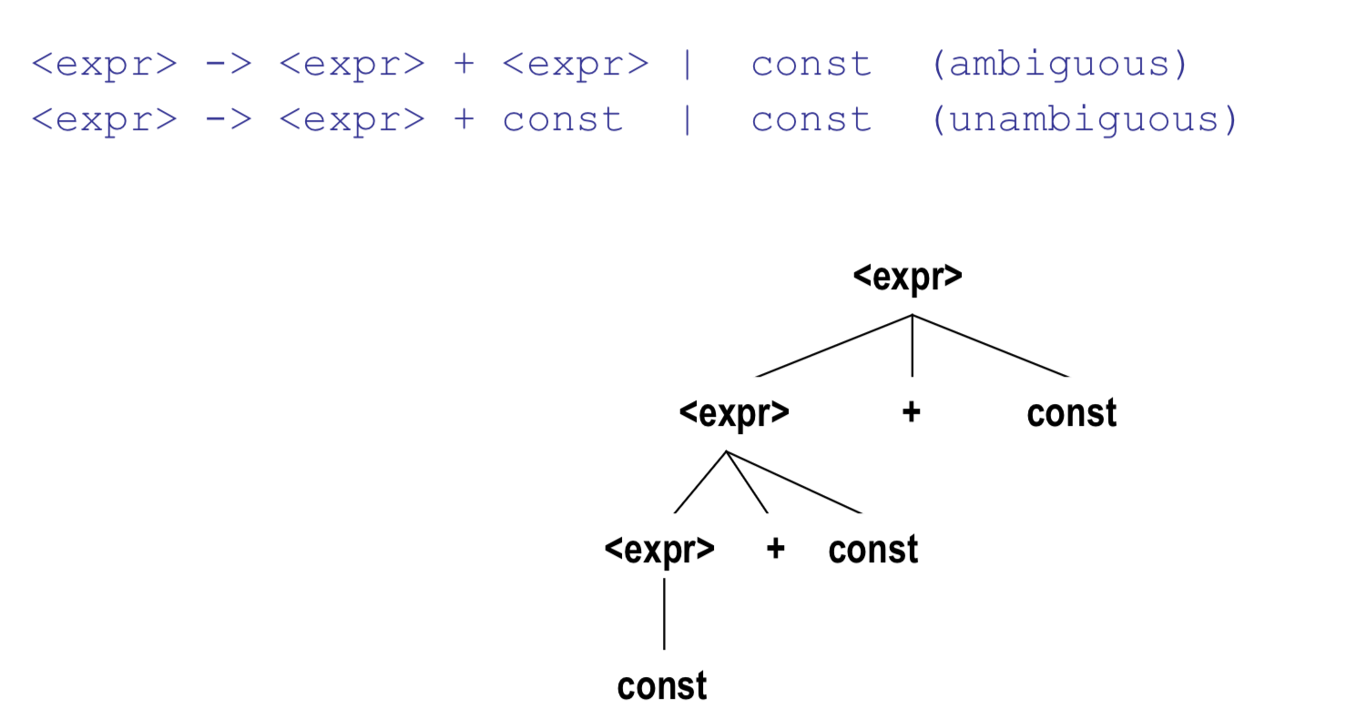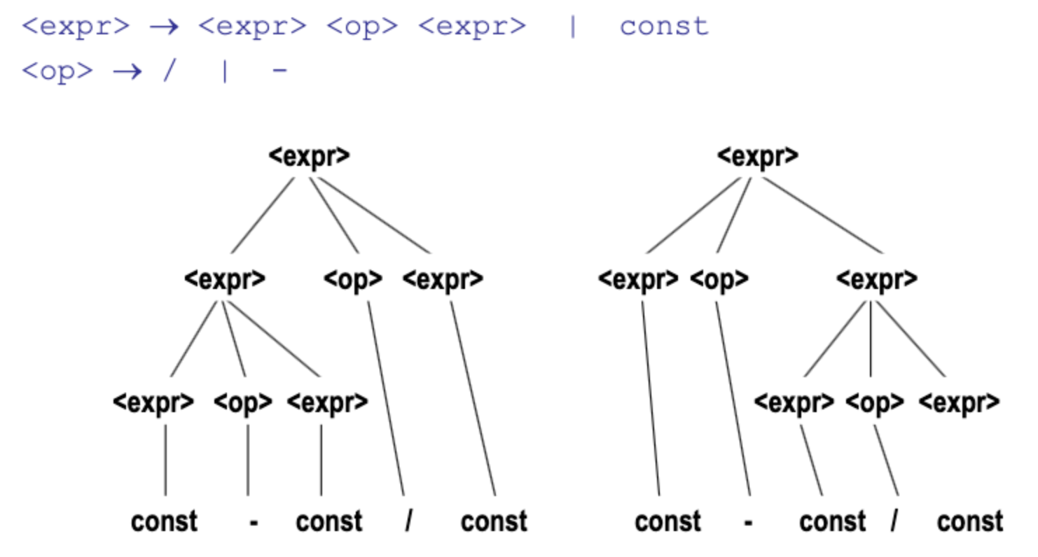 Providen grammar, different parse tree produce the same result. We call this ambiguity which belongs to wrong grammar.