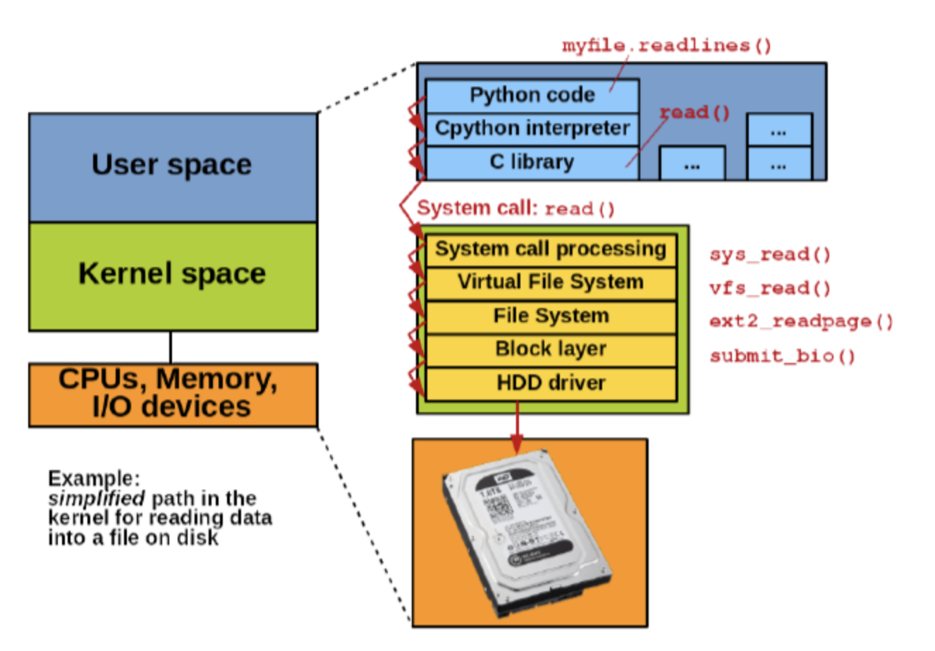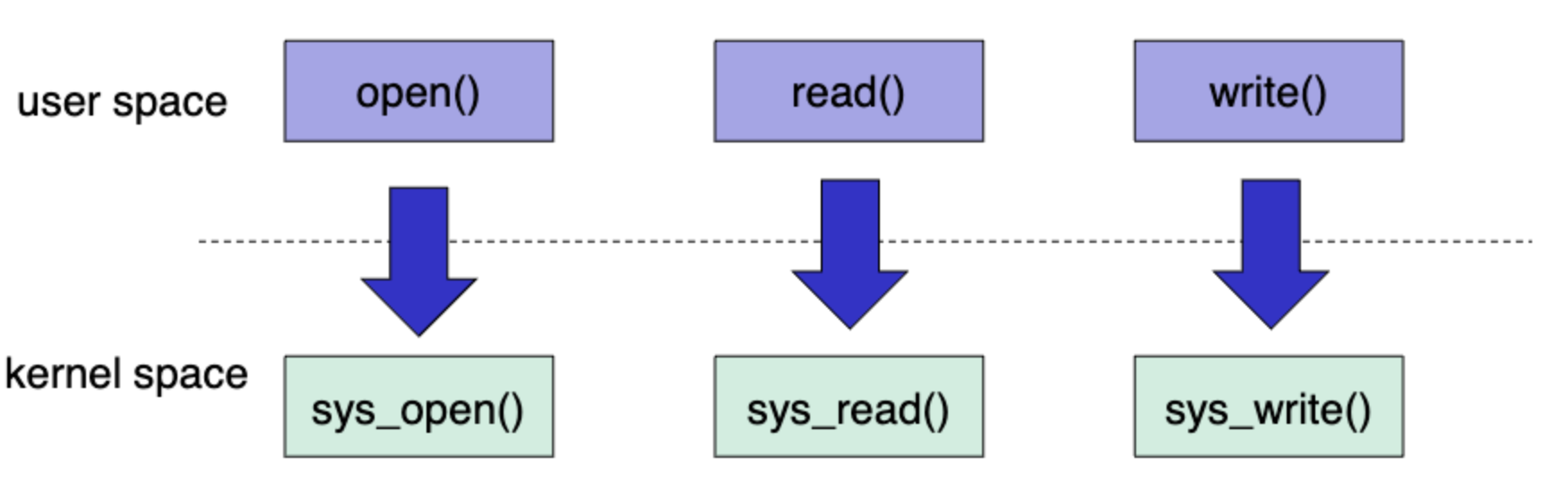 if we execute userspace command to open or write file, cpu will execute kernel space command eventually.