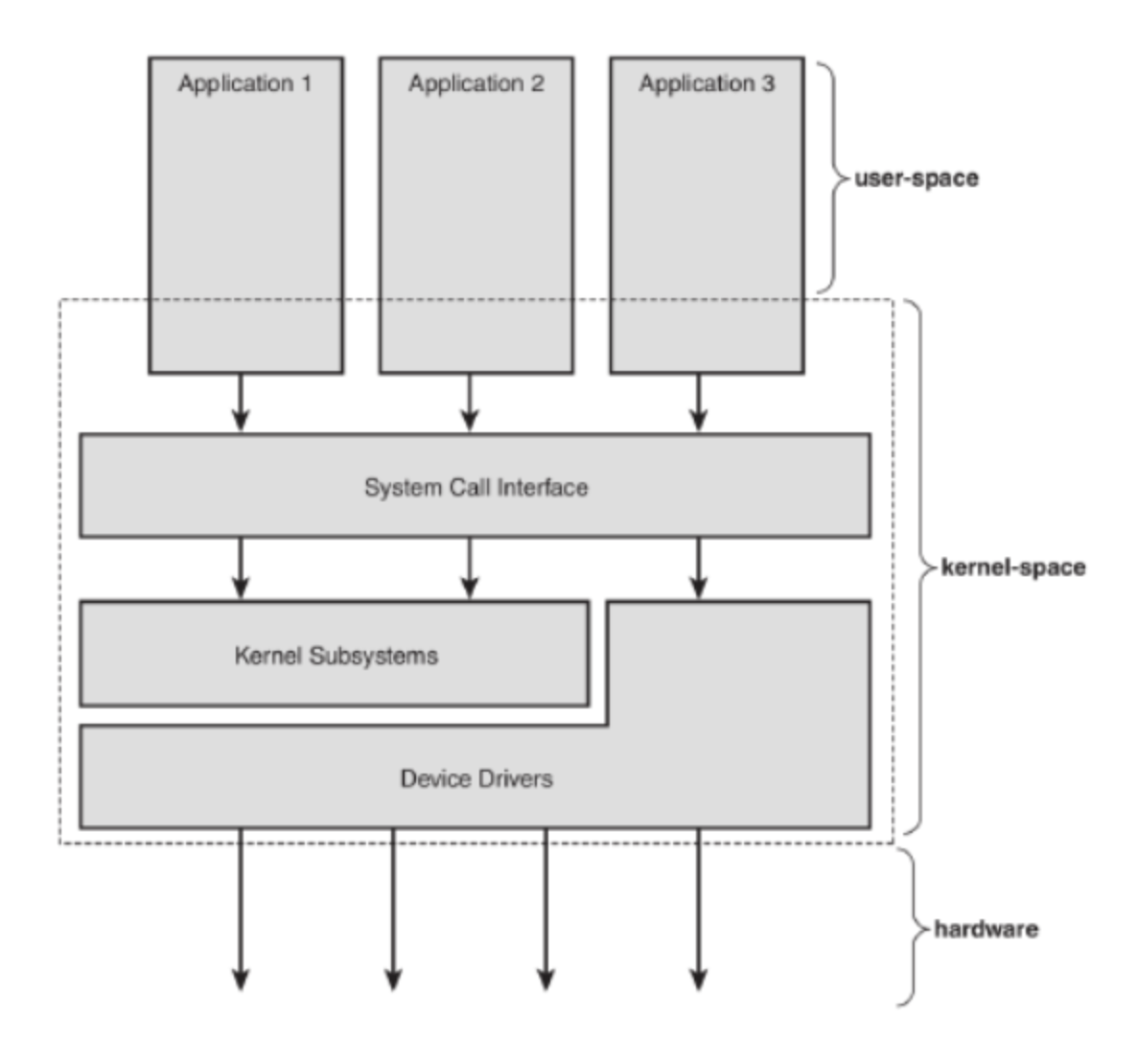 kernel - via system call we can enter kernel space, interact with hardware