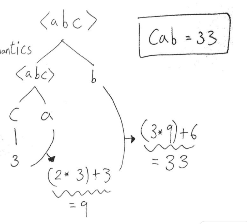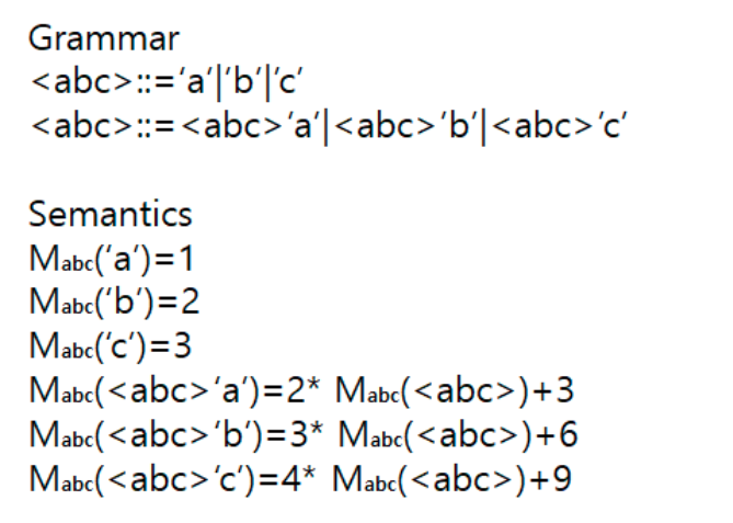 이런 문법이 있다고 해보자. denotational semantics에 의하면 cab의 값을 도출해보자.
