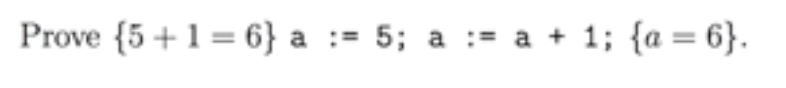{5 + 1 = 6} a:=5 {Q}, {Q} a := a+1 {a=6}
