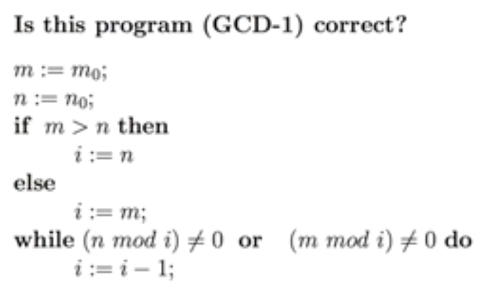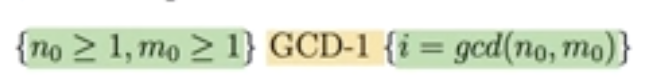 precondition이 true이고 GCD-1이 실행, 종료 뒤, postcondition이 true라는 말이다.