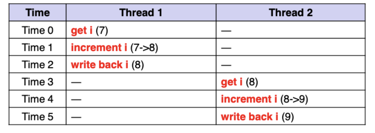 i의 값을 증가시는 함수를 호출하는 두 thread가 있다고 하자. 운이 좋으면 예상하는대로 작업이 진행될 수 있겠지만