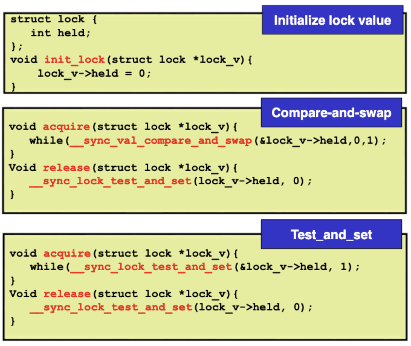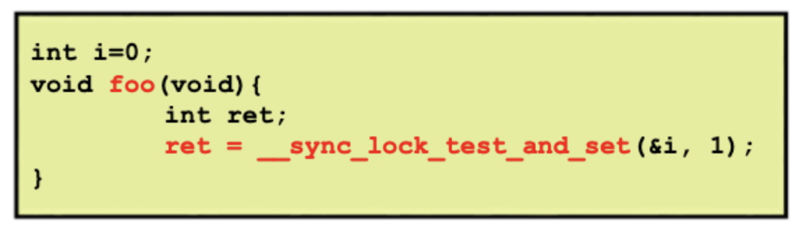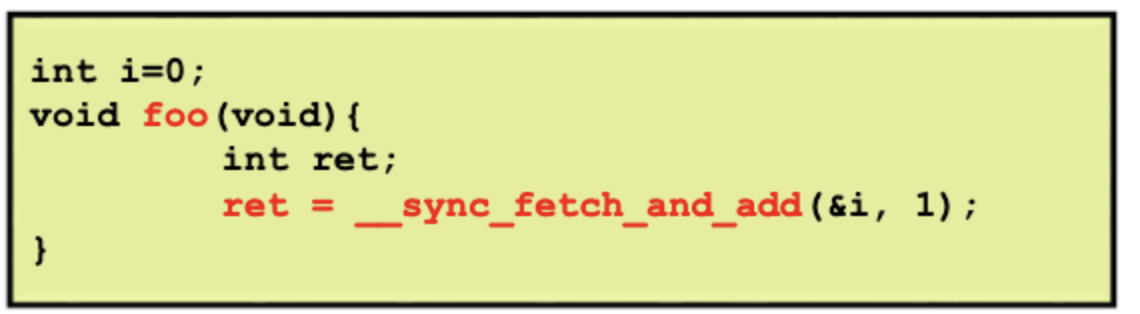 GCC 에도 builtin function으로 atomic operation 함수를 제공한다. 위에서 설명한 어셈블리 코드들을 기반으로 만들어져 있으며 built in 함수들이기 때문에 커널에서든 응용프로그램 영역에서든 gcc로 빌드만 한다면 어디서든 바로 사용할 수 있다.