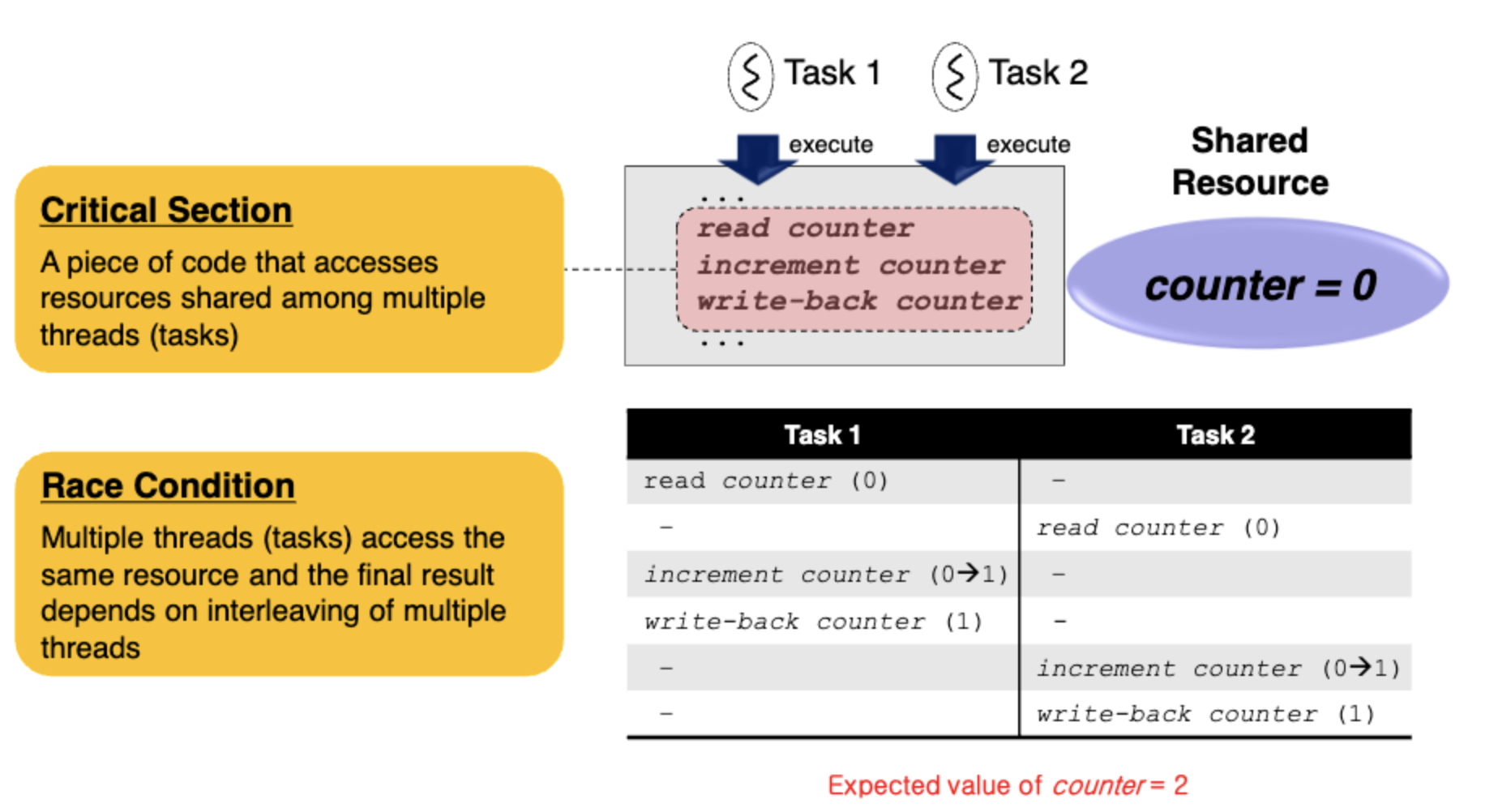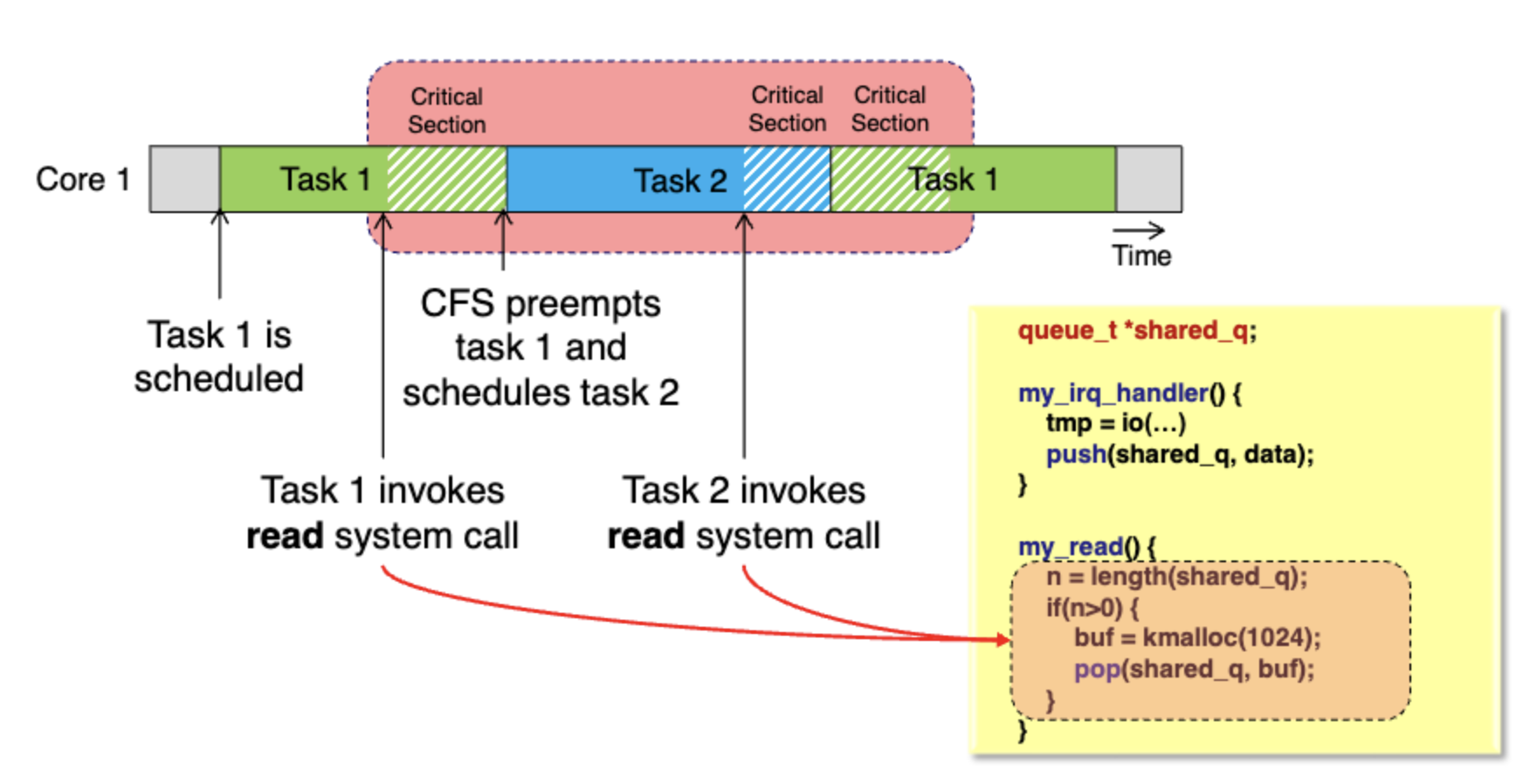 task1이 read를 위해 ciritical section에 진입했다. 이때 cpu 자원을 양보하기 위해 preemption이 발생해서(혹은 block되어 sleep 상태가 되어서) Task1이 중단되고 Task2가 이어서 실행됐다. 똑같이 task2가 read를 수행하려 critical section에 진입한다. 마찬가지로 race condition이 발생한다.