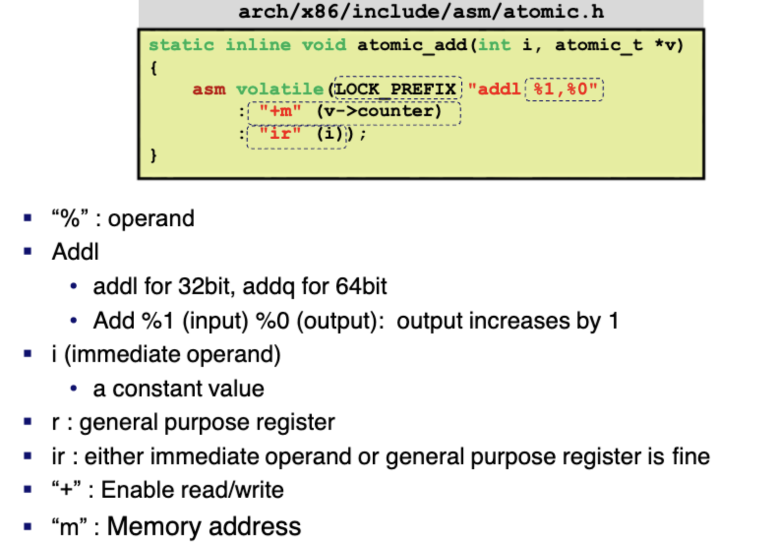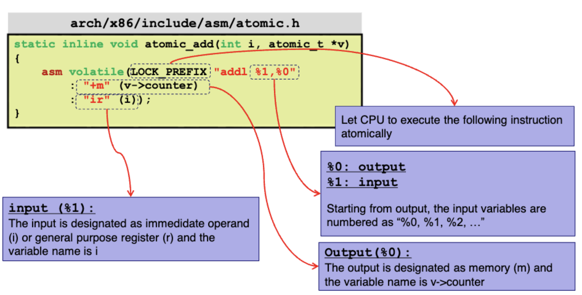 +m (v->counter) : 부분이 %1을 output에 더해서 메모리에 저장하라는 부분이고