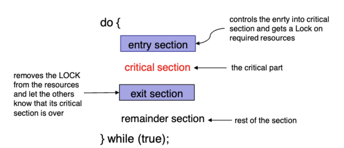 critial section은 한번에 한명만 실행하고 있음을 보장하는 code segment이다. 대게 critical section은 shared variable에 접근하는 부분이다.