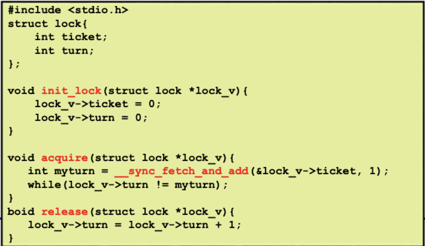 첫번째 쓰레드가 자원을 얻어서 작업을 처리하고 있다. 그런데 뒤이어 2, 3, 4번 쓰레드가 while루프에 걸렸다. 1번 쓰레드가 자원을 반환했을 때, 이어서 누가 자원을 확보할지 알수 없다. 최악에 상황에는 먼저 도착한 2번이 끝까지 자원을 얻지못하는 starvation이 일어날 수도 있다. 이런 unfairness를 해결하기 위한 방법으로 ticket lock 을 fetch-and-add로 쉽게 구현할 수 있다.