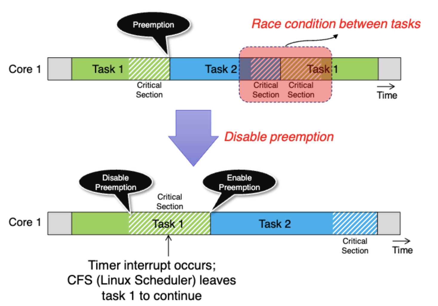 아까의 상황에서 critical section을 preemption disable로 보호할 수 있다. 그럼 Task1의 critical section이 끝날때까지 cpu는 작업을 계속한다.