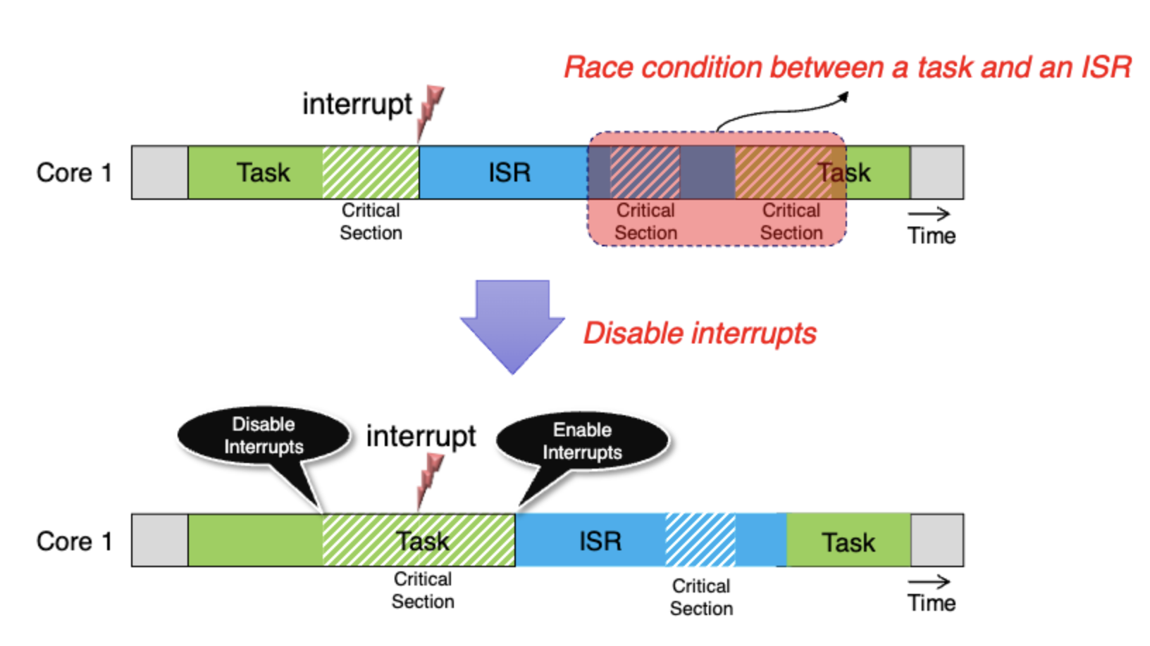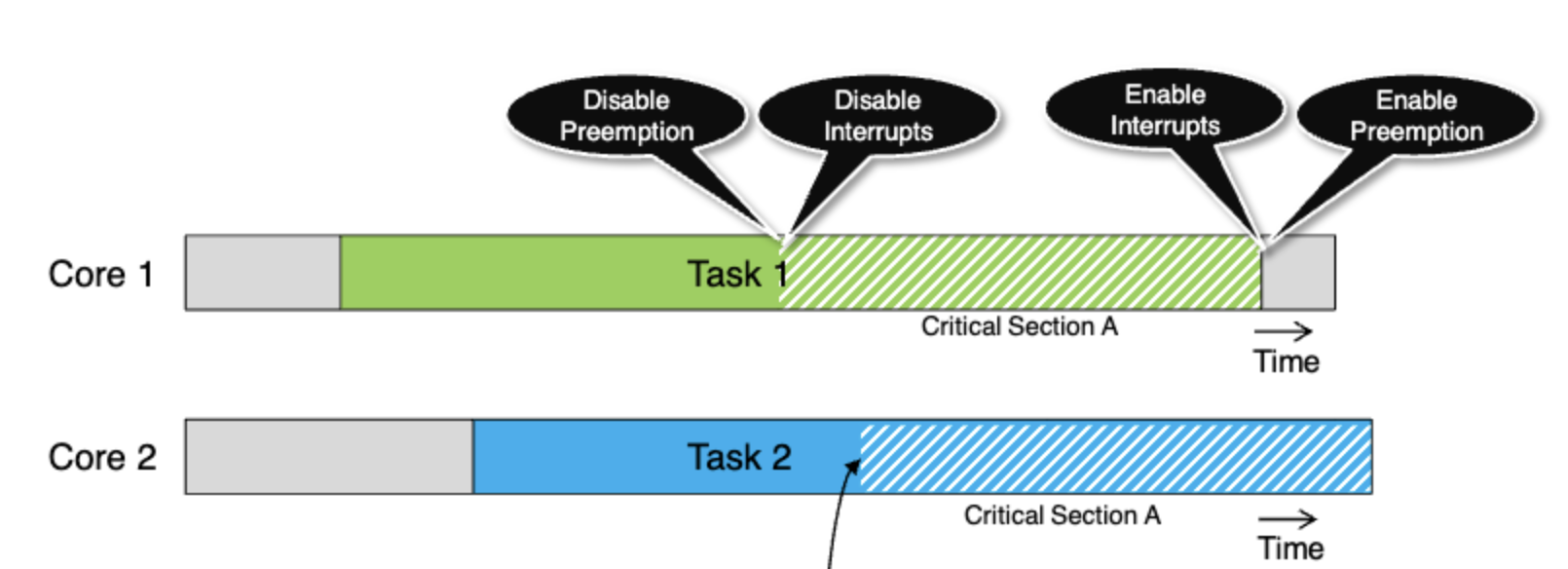 single core에서는 preemption과 interrupt를 둘다 막았을 때 아무 문제가 없을 수 있지만 그림처럼 multicore환경에서는 동시에 task2가 critical section에 진입하는 경우가 생길 수 있다. 따라서 multicore환경에서는 lock, atomic operation등이 추가로 필요하다.